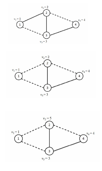 由颜色1构成的从节点1到节点4的路径有 1 – 2 – 4,故max{v1, v2, v4} = max{ 1, 5, 4 } = 5。