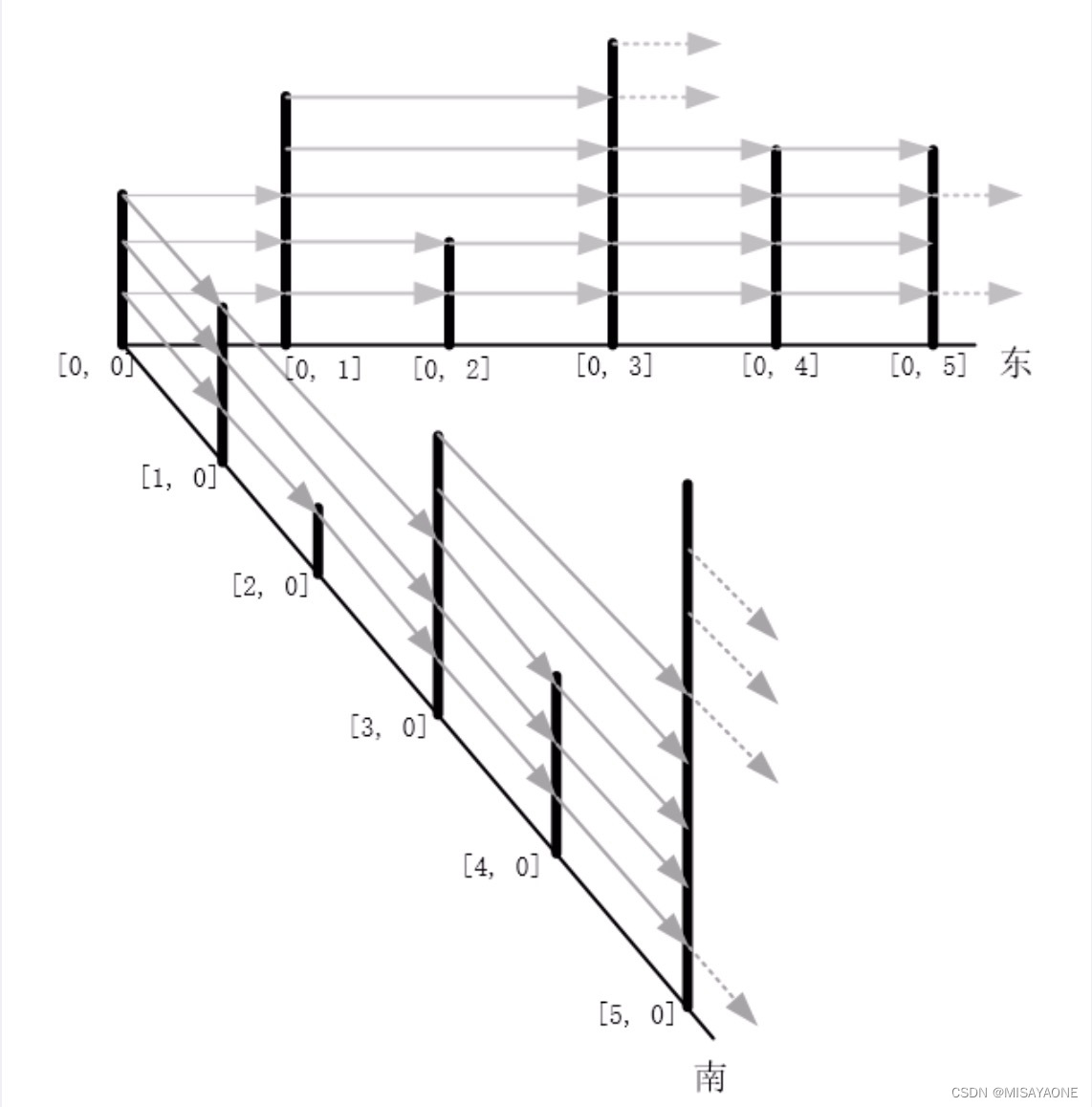 如下图示意:在天线矩阵的第0行上, 天线[0,0]接收不到任何其他天线的信号,天线[0,1]可以接收到天线[0.0]的信号,天线[02]可以接收到天线[0,1]的信号,天线[0,3]可以接收到天线[0,1]和天线10.2]的信号,天线[0.4l可以接收到天线[0.3l的信号,天线10.51可以接收到天线[0.4l的信号;在天线矩阵的第0列上,天线[0,0]接收不到任何其他天线的信号,天线[1,0]可以接收到天线[0,0]的信号,天线[2.0]可以接收到天线[1.0]的信号,天线[3.0]可以接收到天线[1.0]和天线[2.0]的信号,天线[4.0]可以接收到天线[3,0]的信号,天线[5,0]可以接收到天线[3,0]和天线[4,0]的信号